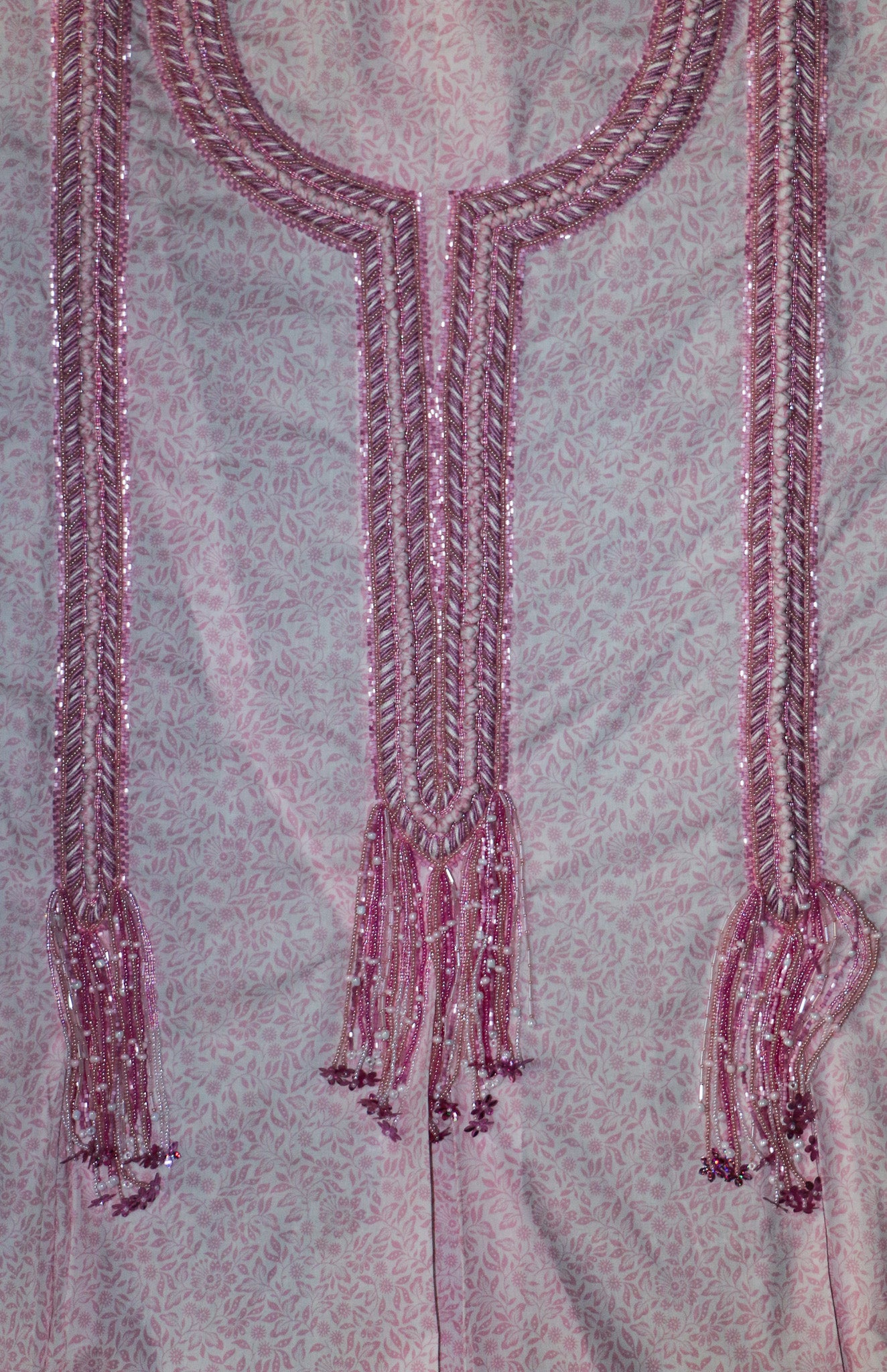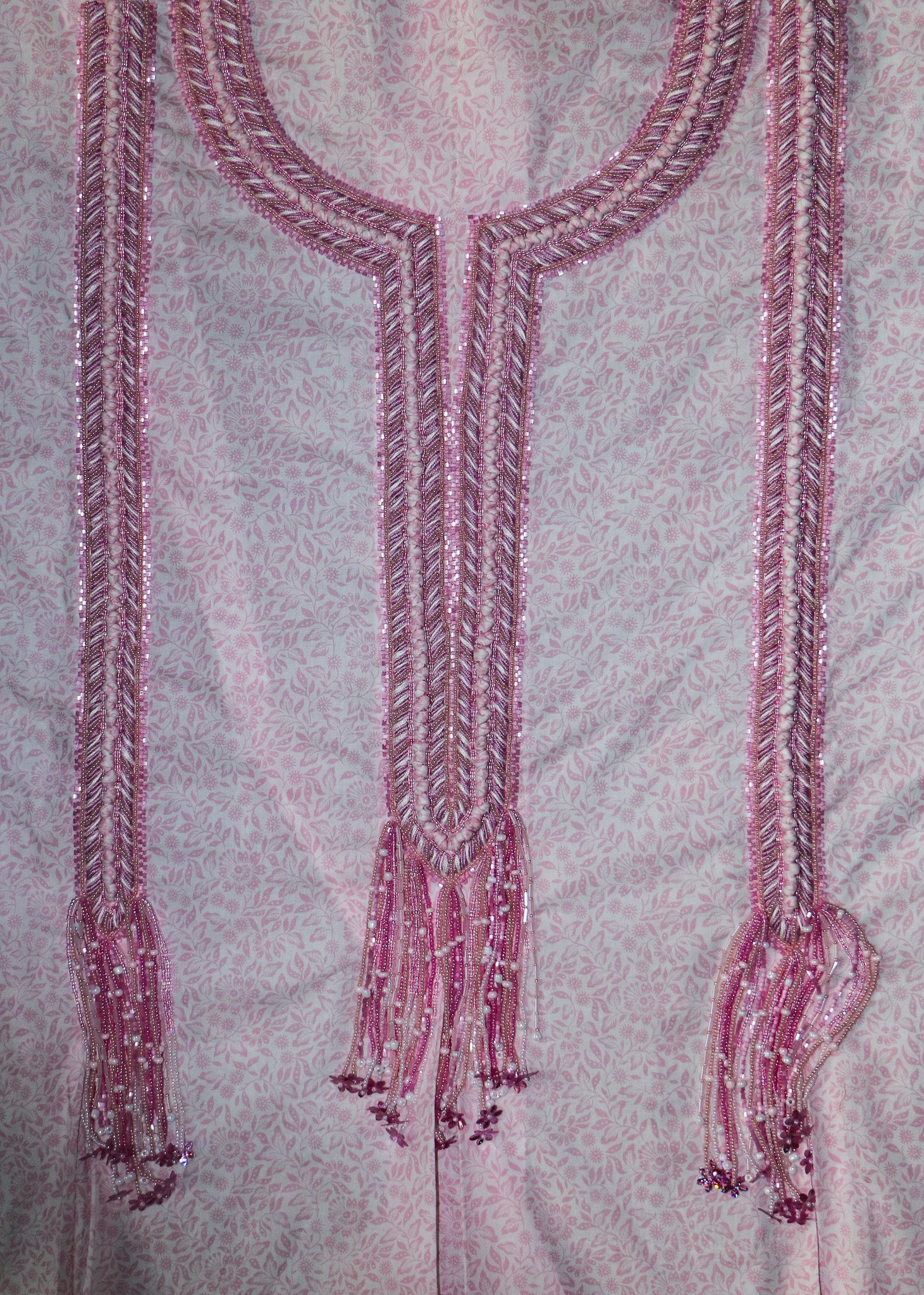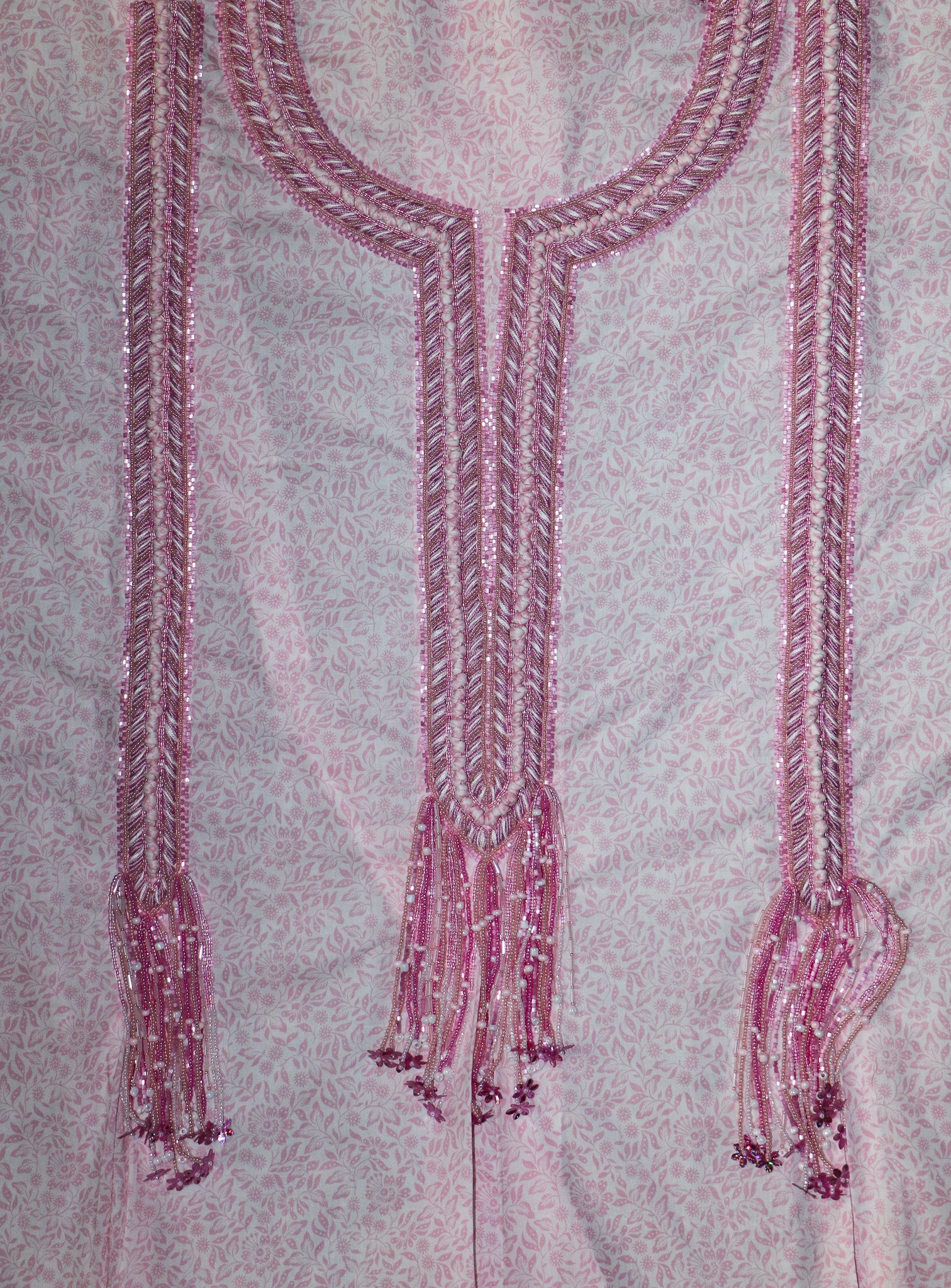 This delicate embroidery flows like a gentle waterfall of blush pink threads, sequins, and beads. The neckline is framed with intricate herringbone stitches, shimmering with soft light, while the long tassels descend gracefully, adorned with tiny blossoms and sparkling details.