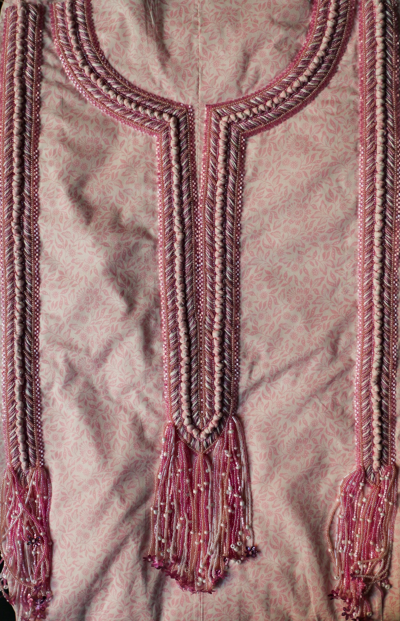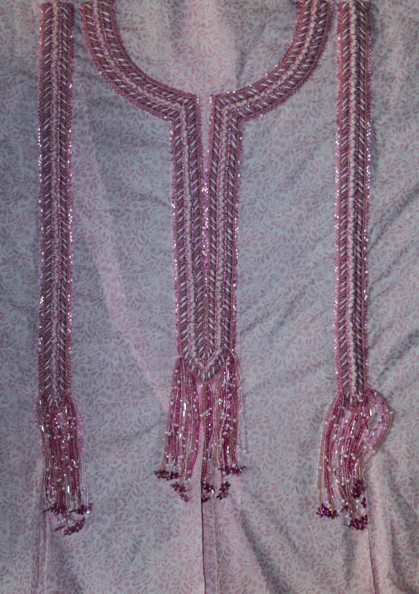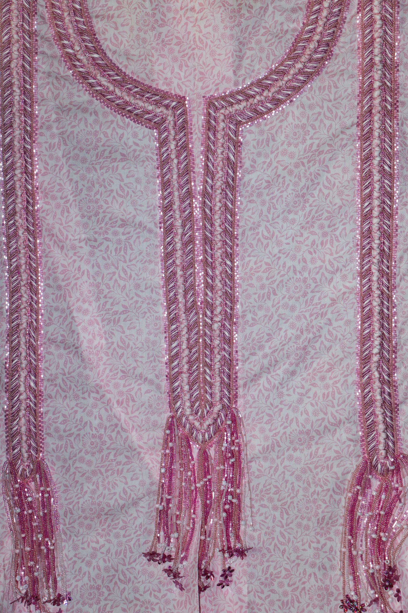 This delicate embroidery flows like a gentle waterfall of blush pink threads, sequins, and beads. The neckline is framed with intricate herringbone stitches, shimmering with soft light, while the long tassels descend gracefully, adorned with tiny blossoms and sparkling details.