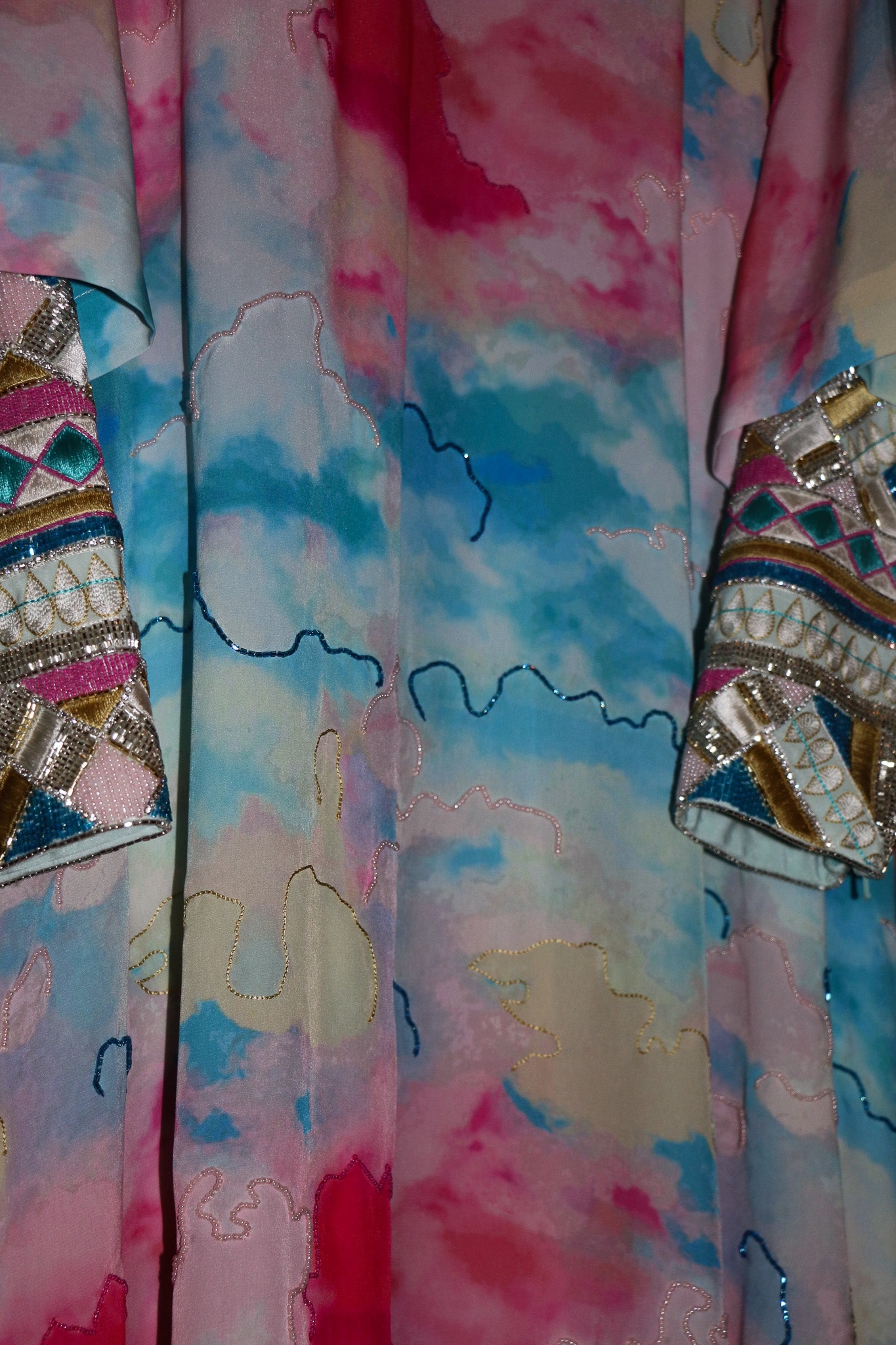 A thob that drifts between dream and dawn — Cloud Sonata captures the serenity of a painted sky after rain. The fabric blooms in soft watercolored hues of rose, azure, and ivory, whispering the calm of floating clouds. Each sleeve is adorned with intricate hand embroidery — a symphony of shimmering threads and geometric motifs — evoking the delicate harmony of tradition meeting art.