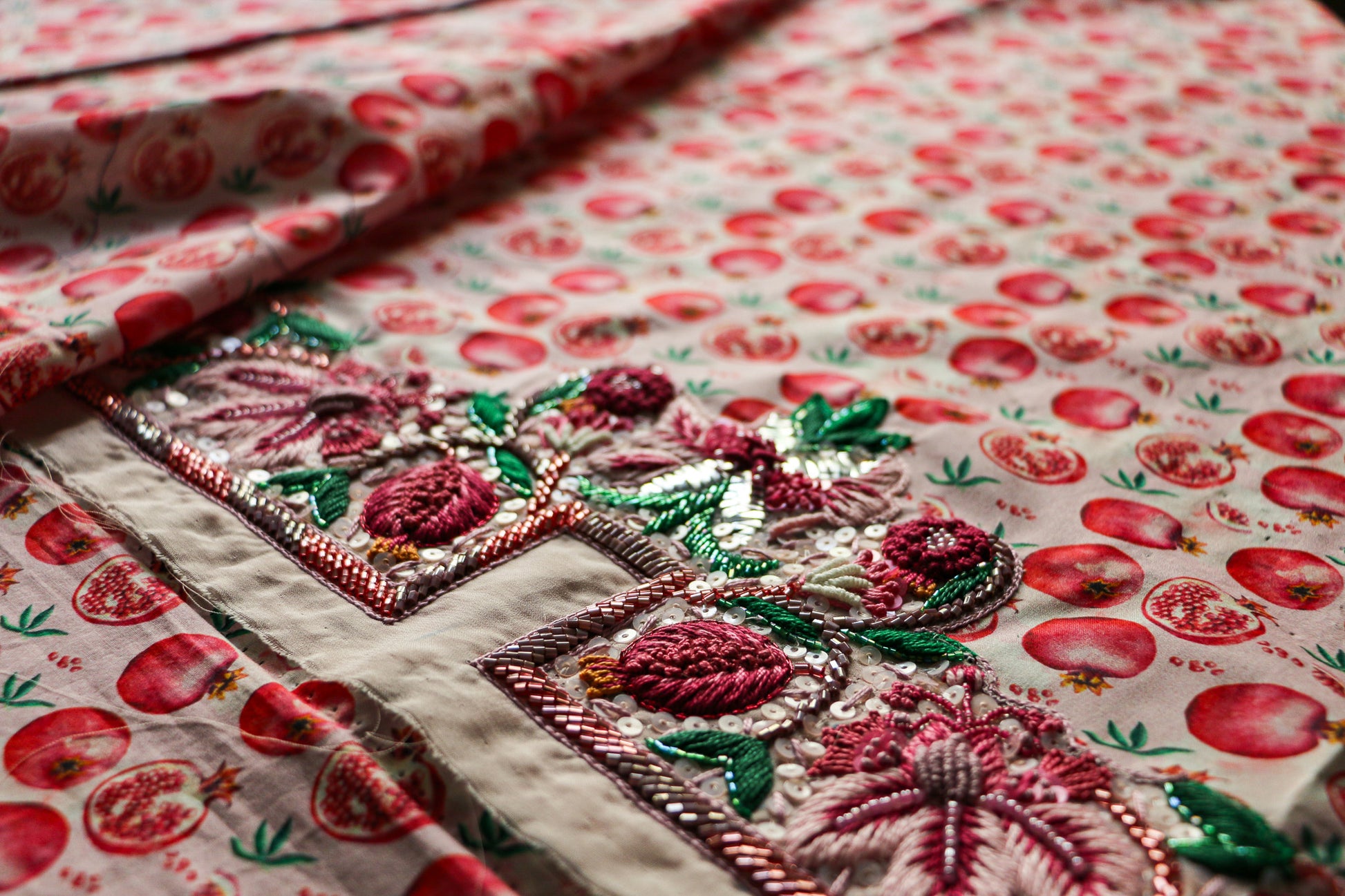 An orchard of ruby fruits blossoms across the fabric, each seed a spark of life, each vine a thread of wonder. Sequins shimmer like dew at dawn, while the pomegranate symbol of abundance and mystery transforms this embroidery into an enchanted garden, timeless and alive.
