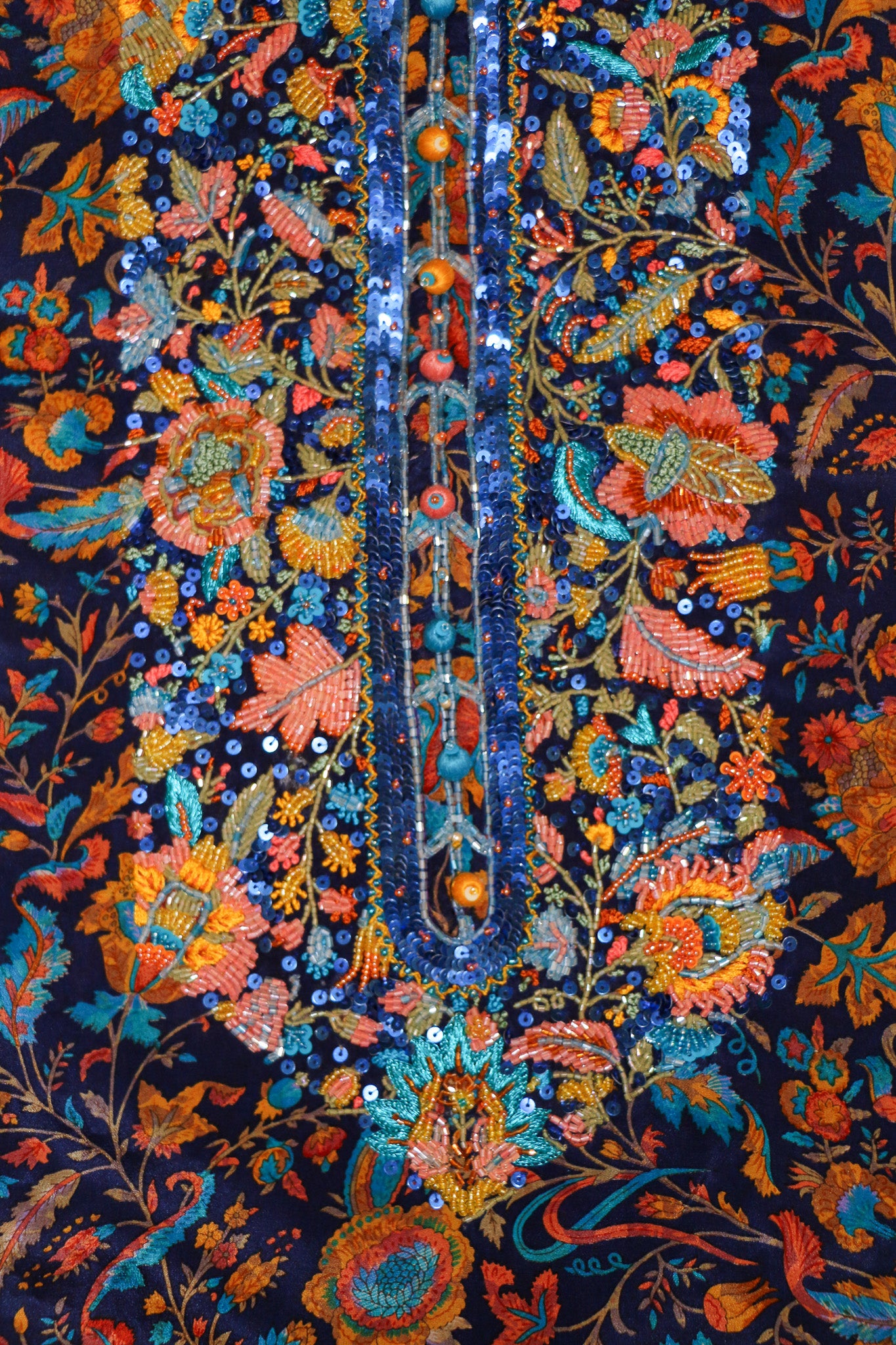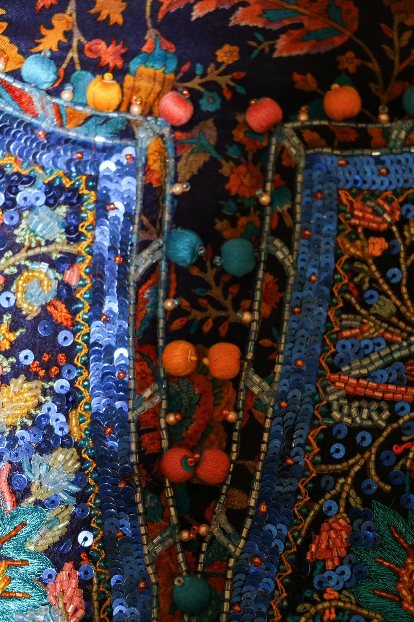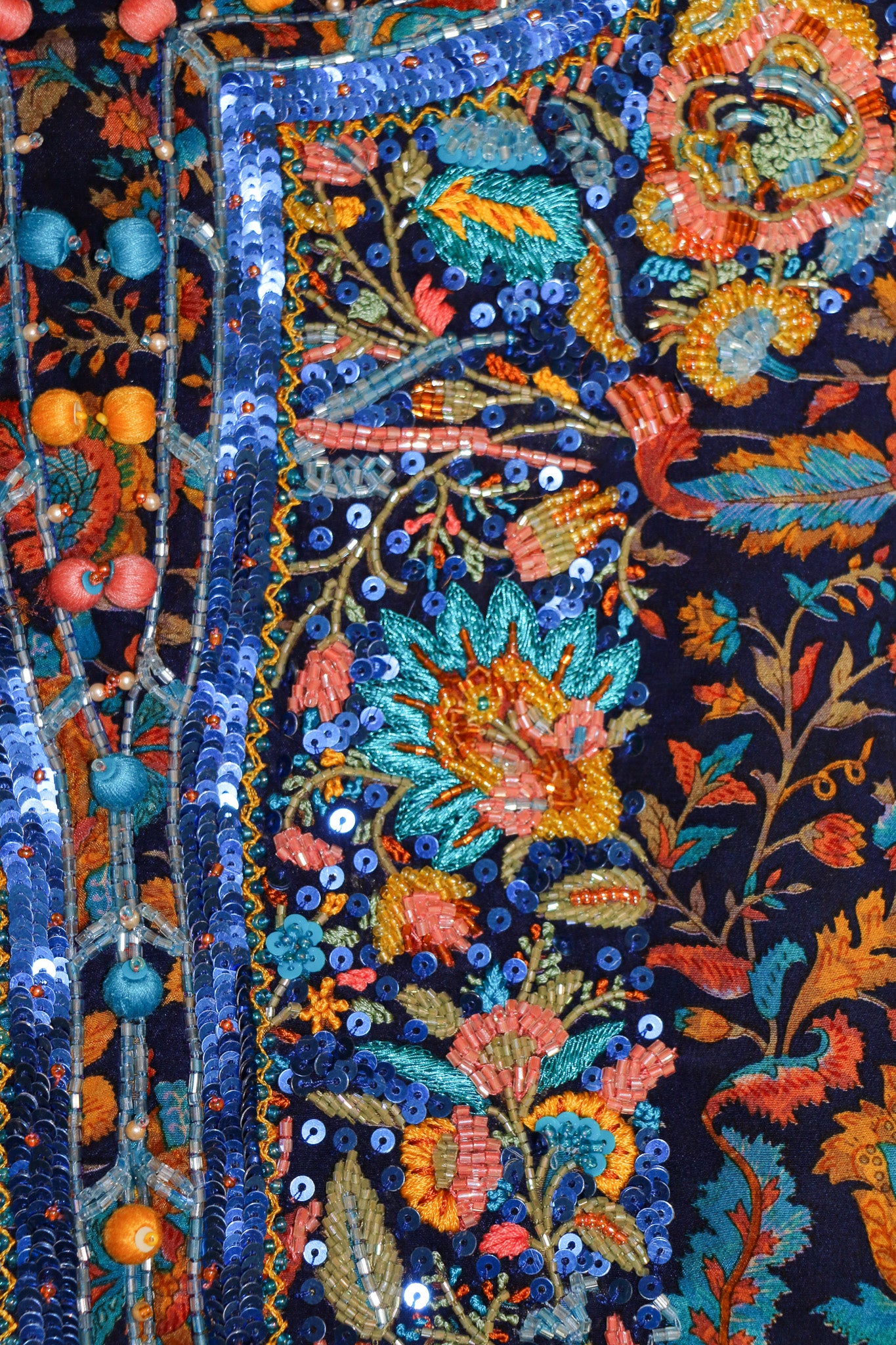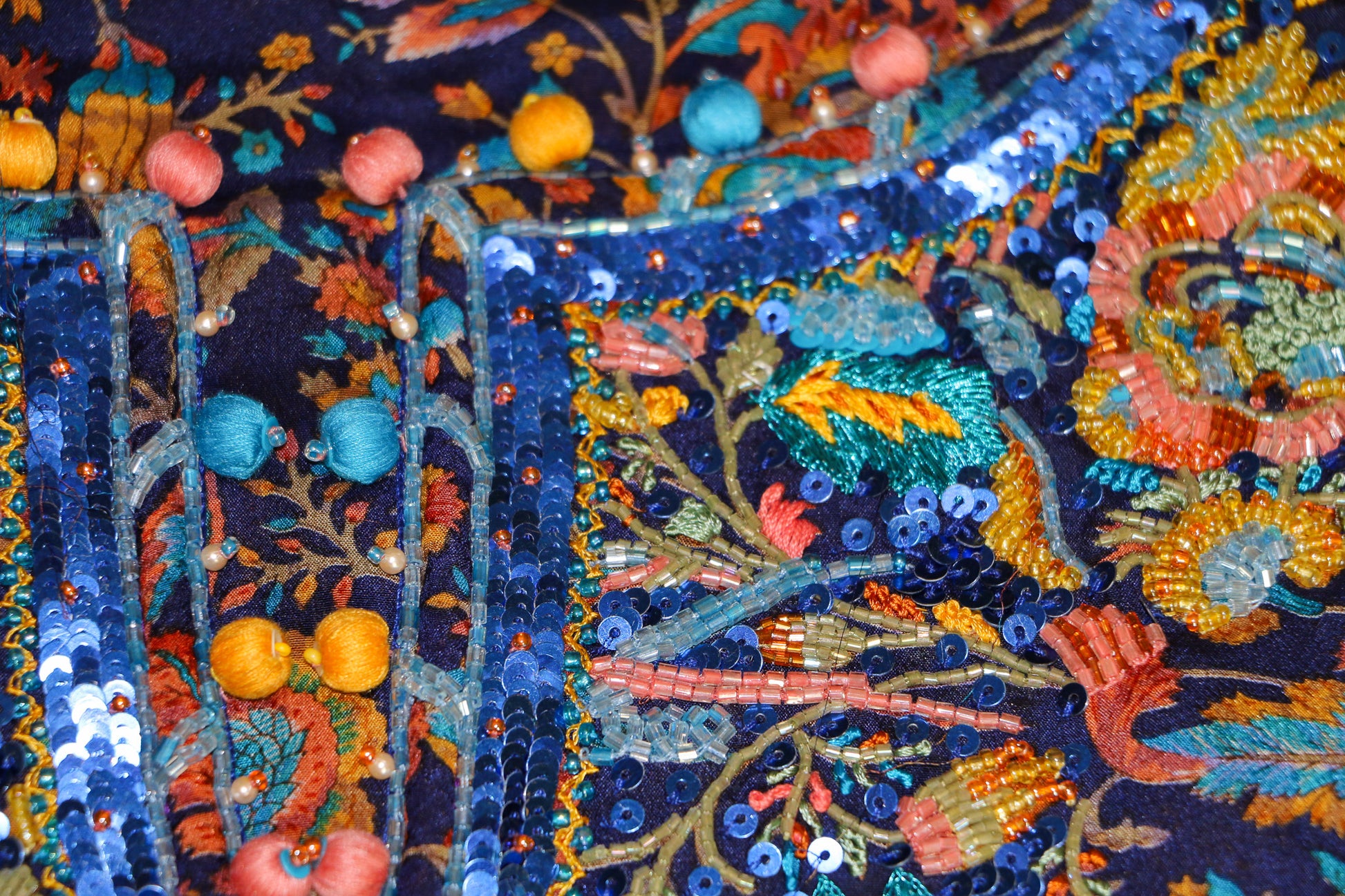 Deep indigo fabric becomes a night sky, lit by shimmering blue sequins that flicker like lanterns swaying in an old souq. Coral, saffron, and turquoise blossoms bloom across the surface—vivid as spices piled high in a desert bazaar. Glossy beads trace winding floral vines, while soft thread baubles mimic tiny fruits hanging from a moonlit orchard.