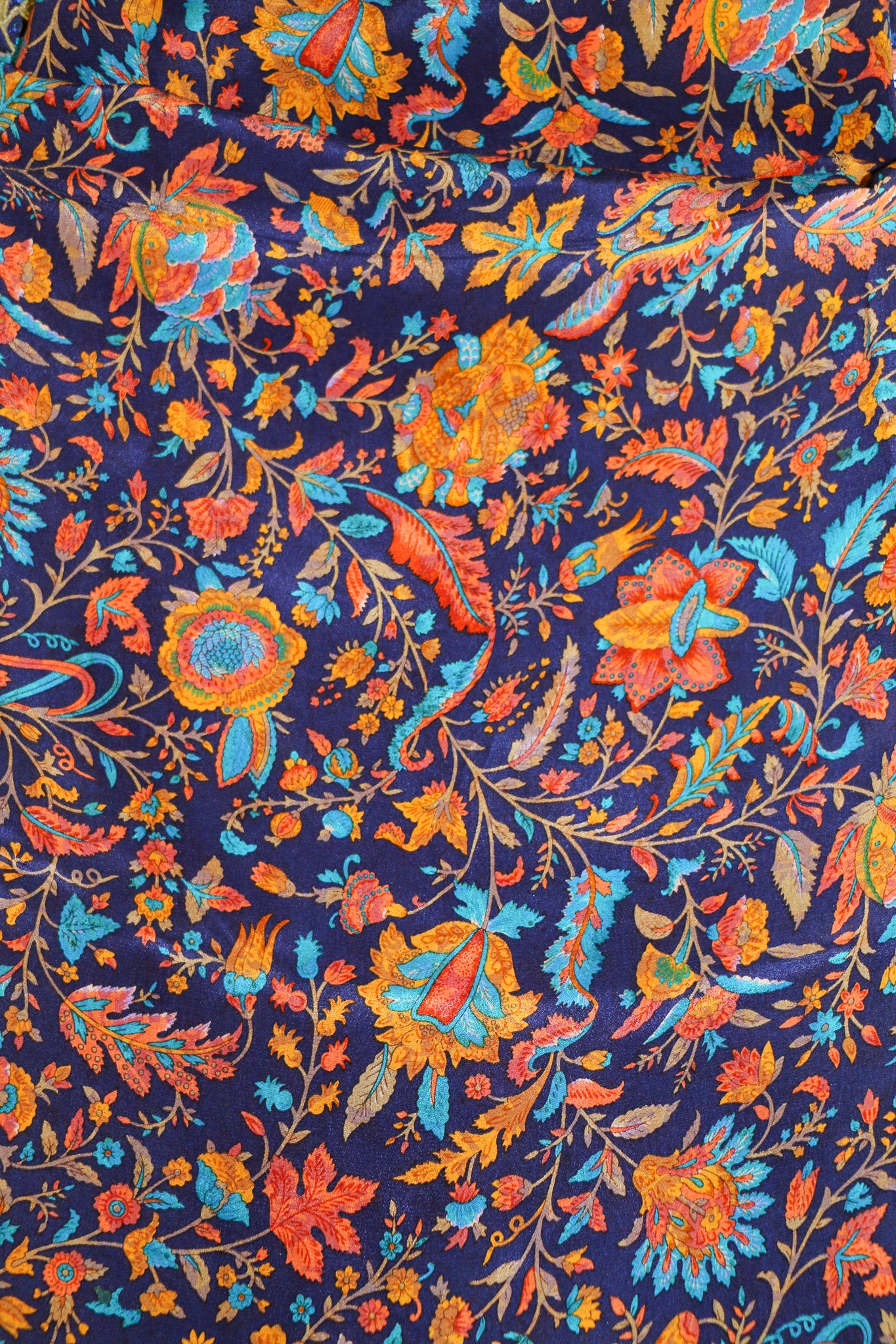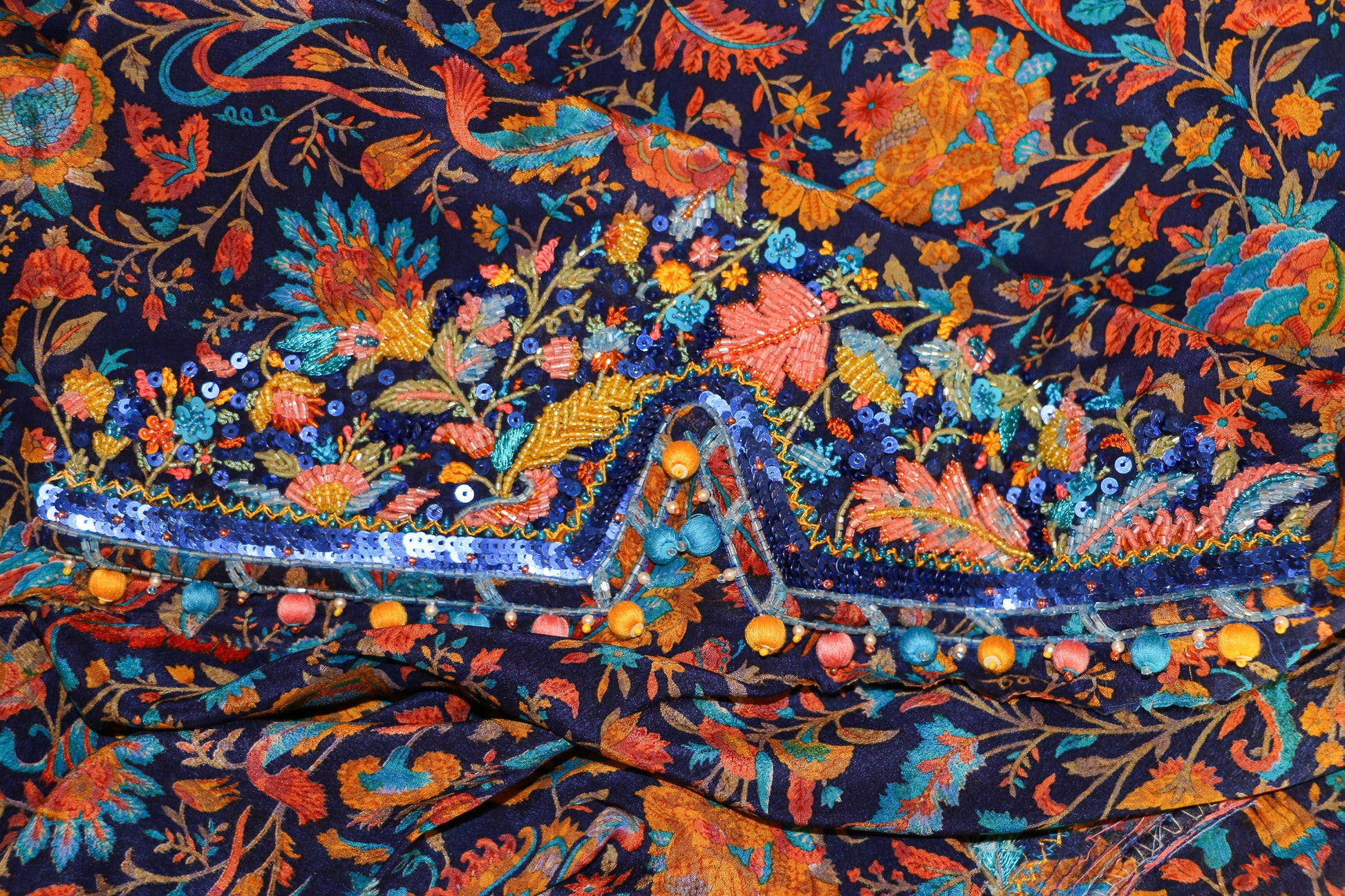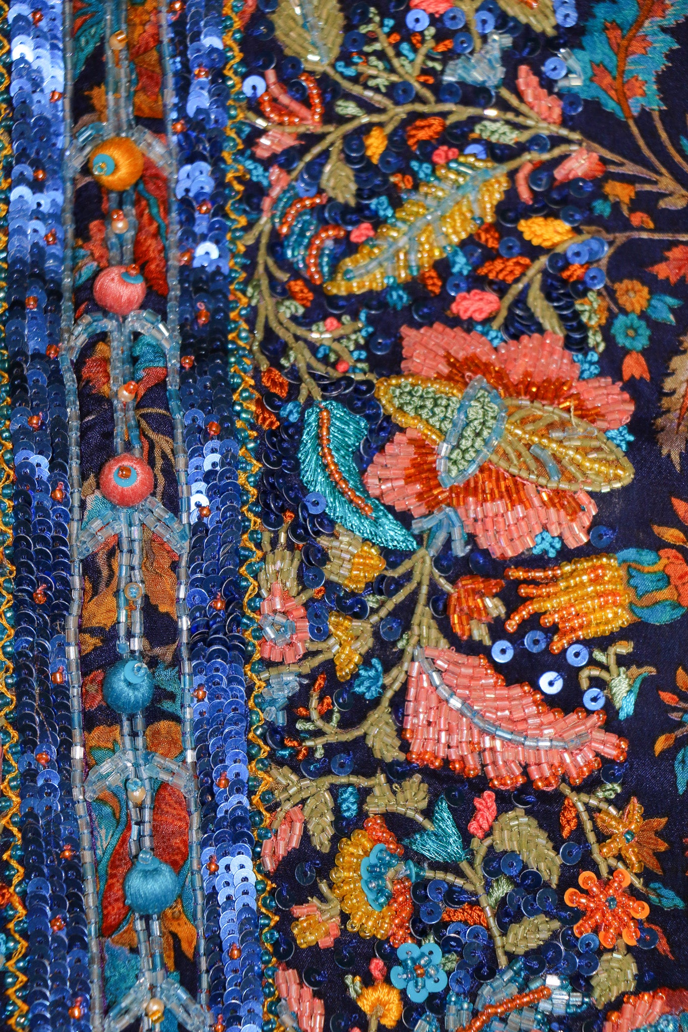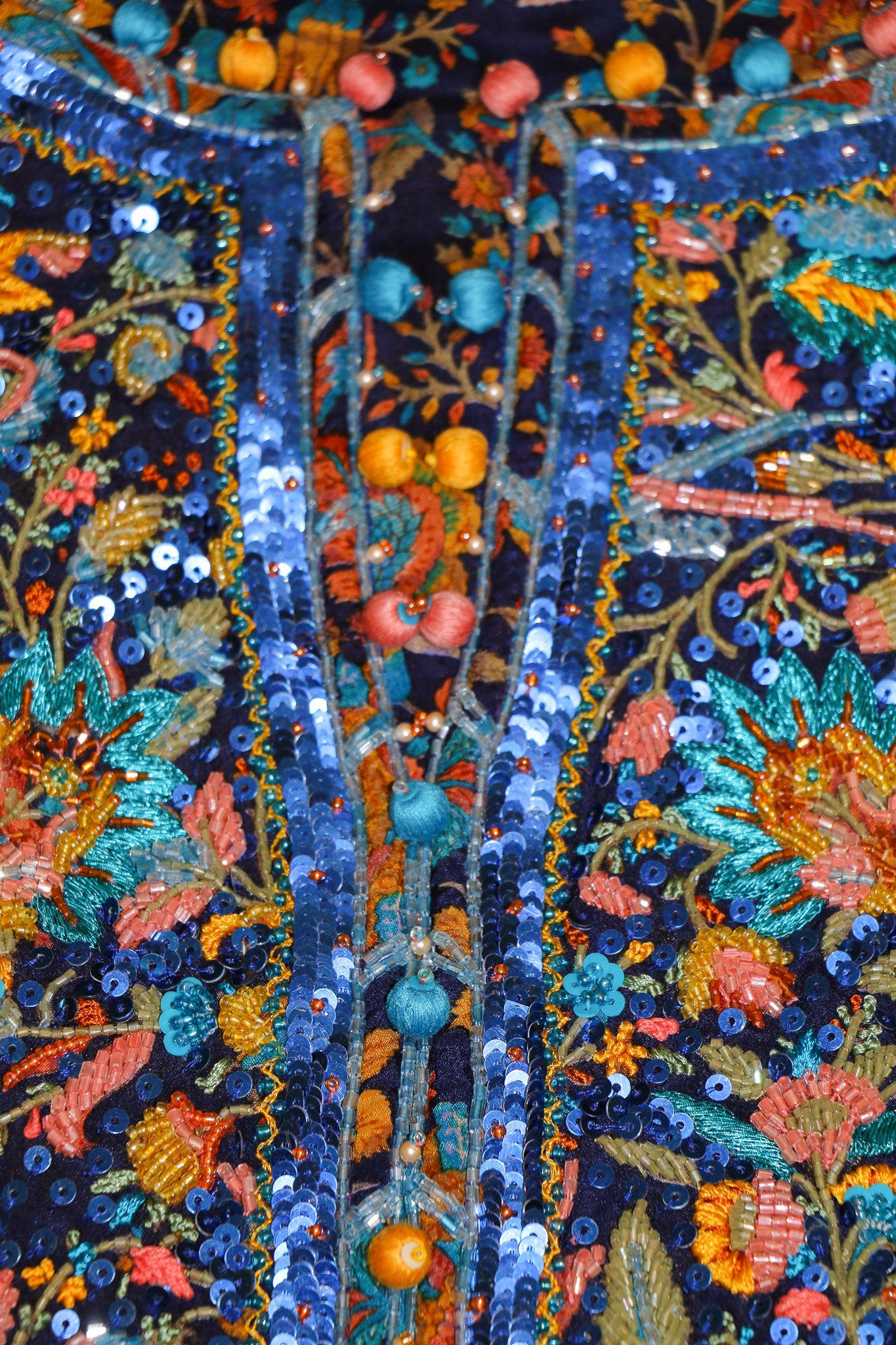 Deep indigo fabric becomes a night sky, lit by shimmering blue sequins that flicker like lanterns swaying in an old souq. Coral, saffron, and turquoise blossoms bloom across the surface—vivid as spices piled high in a desert bazaar. Glossy beads trace winding floral vines, while soft thread baubles mimic tiny fruits hanging from a moonlit orchard.