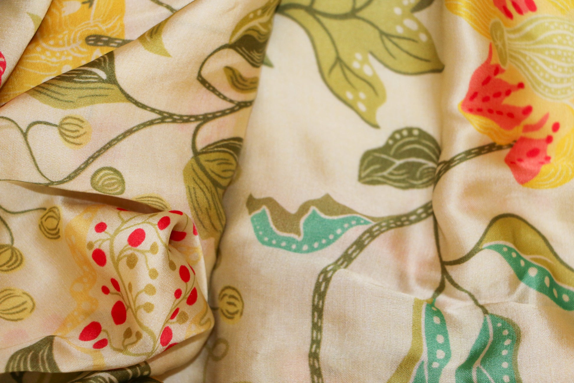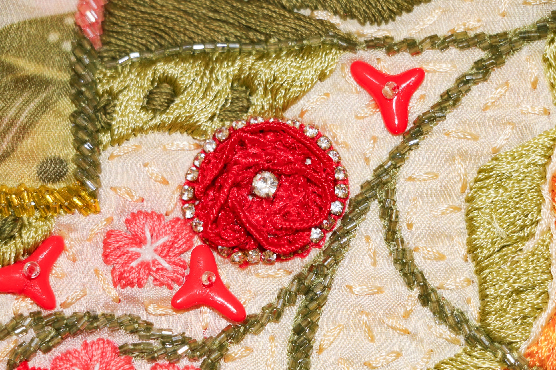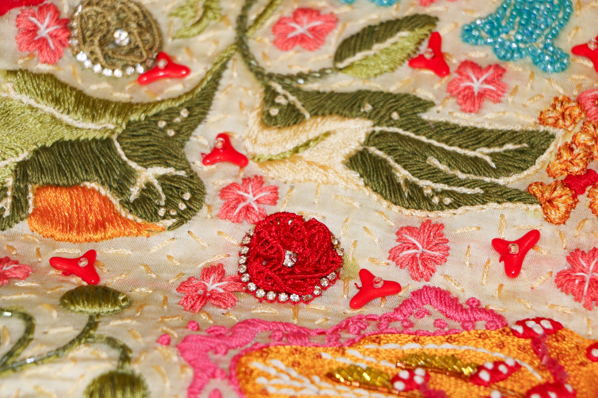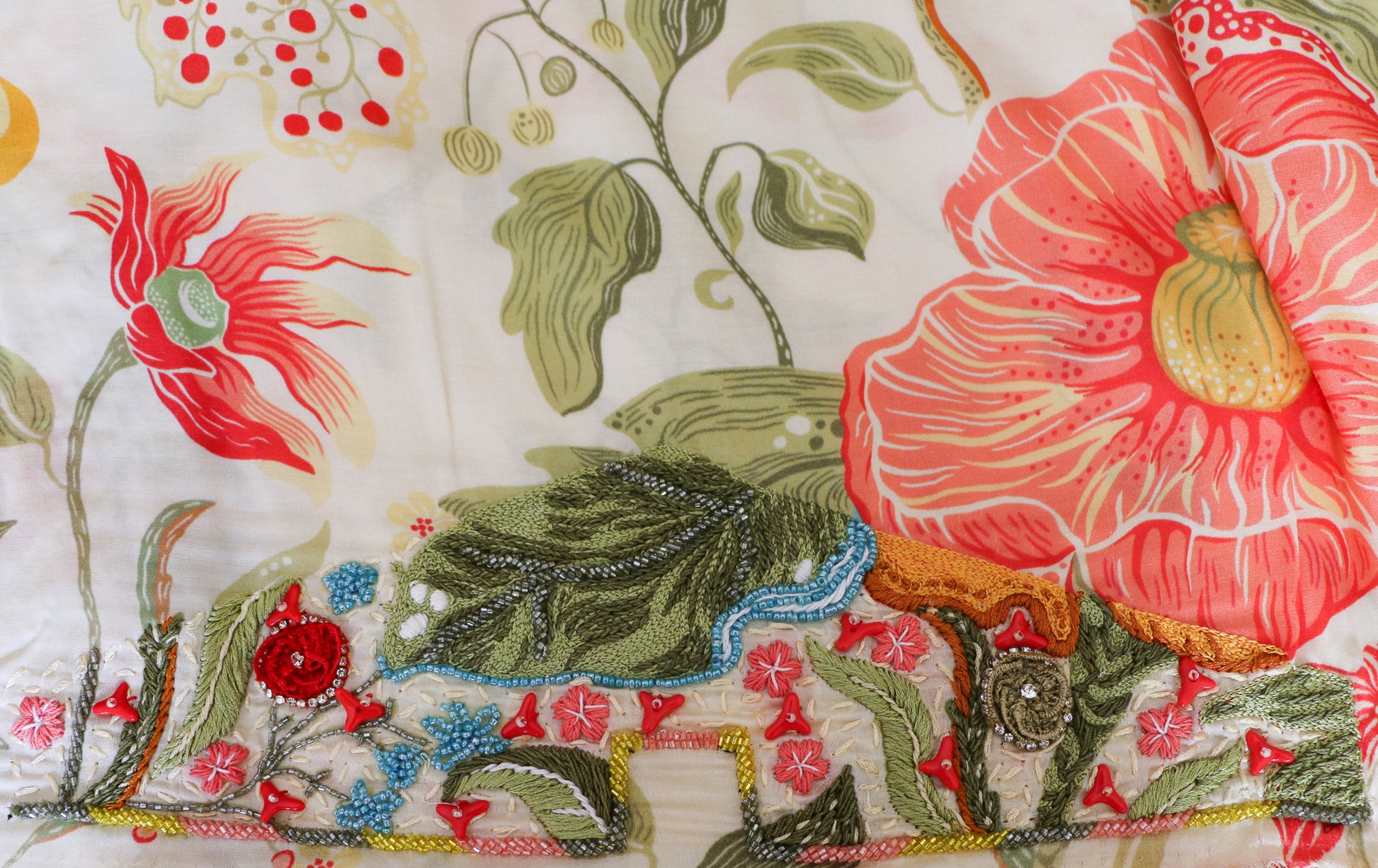 A celebration of wild gardens in full bloom, this mukhawar is adorned with hand-embroidered petals, saffron florals, and coral clusters that whisper of summer mornings in an old Emirati courtyard. Every stitch blooms with quiet luxury—lush leaves, delicate vines, and jeweled blossoms dancing across the fabric like a secret garden brought to life.