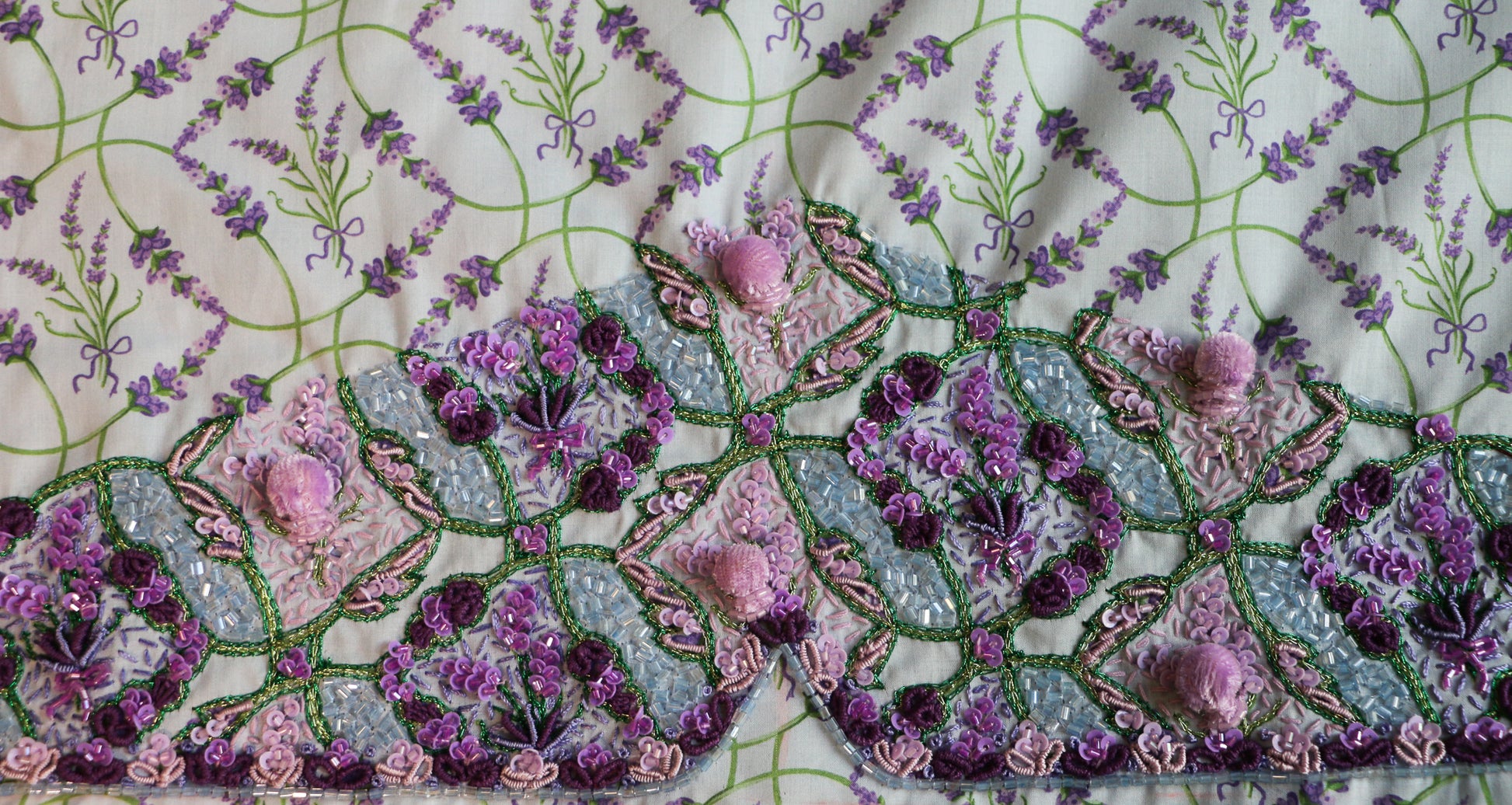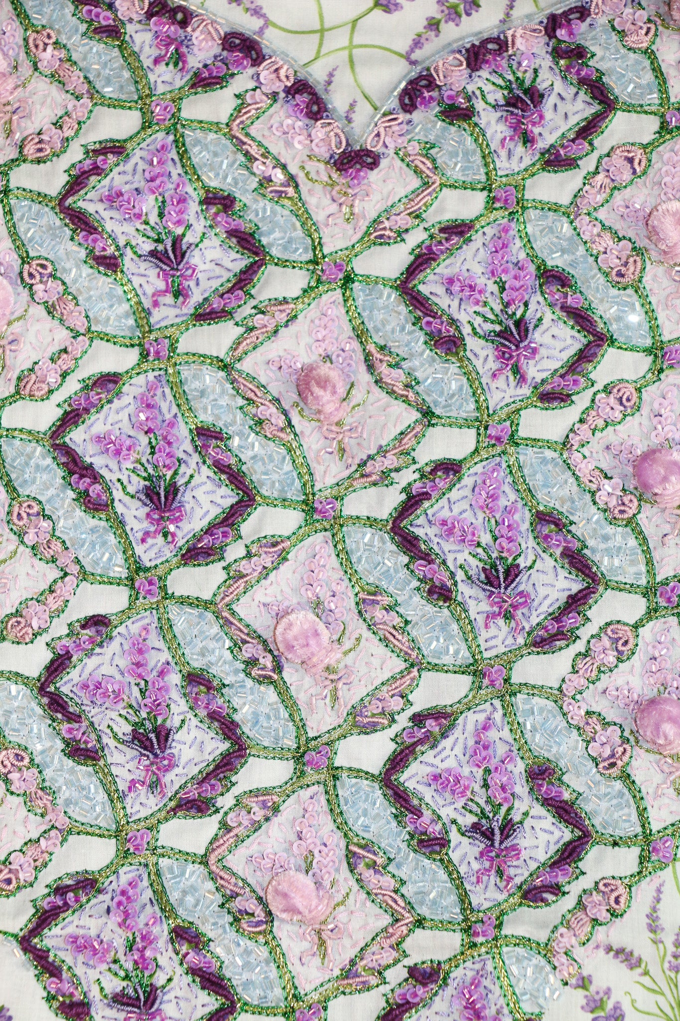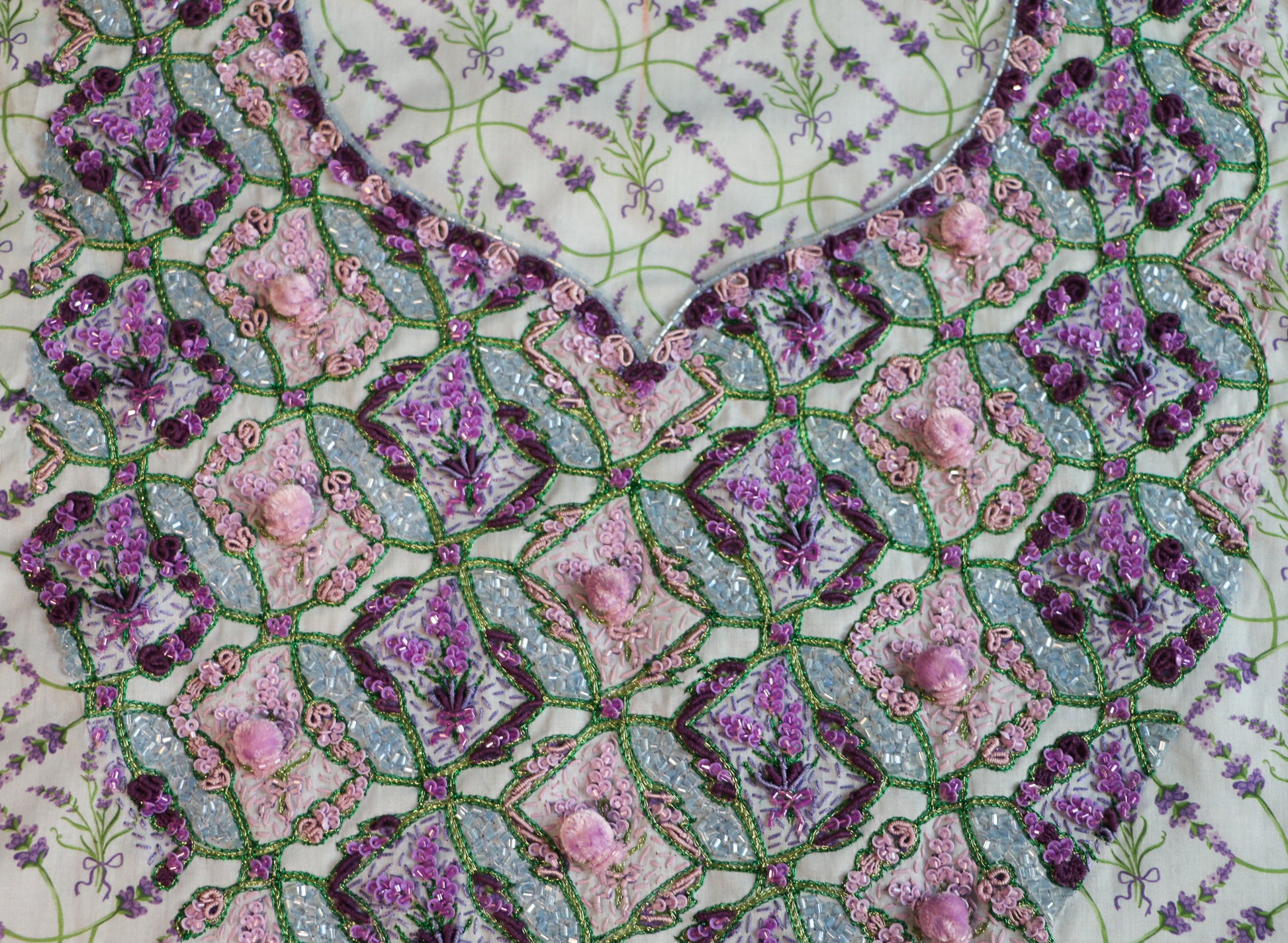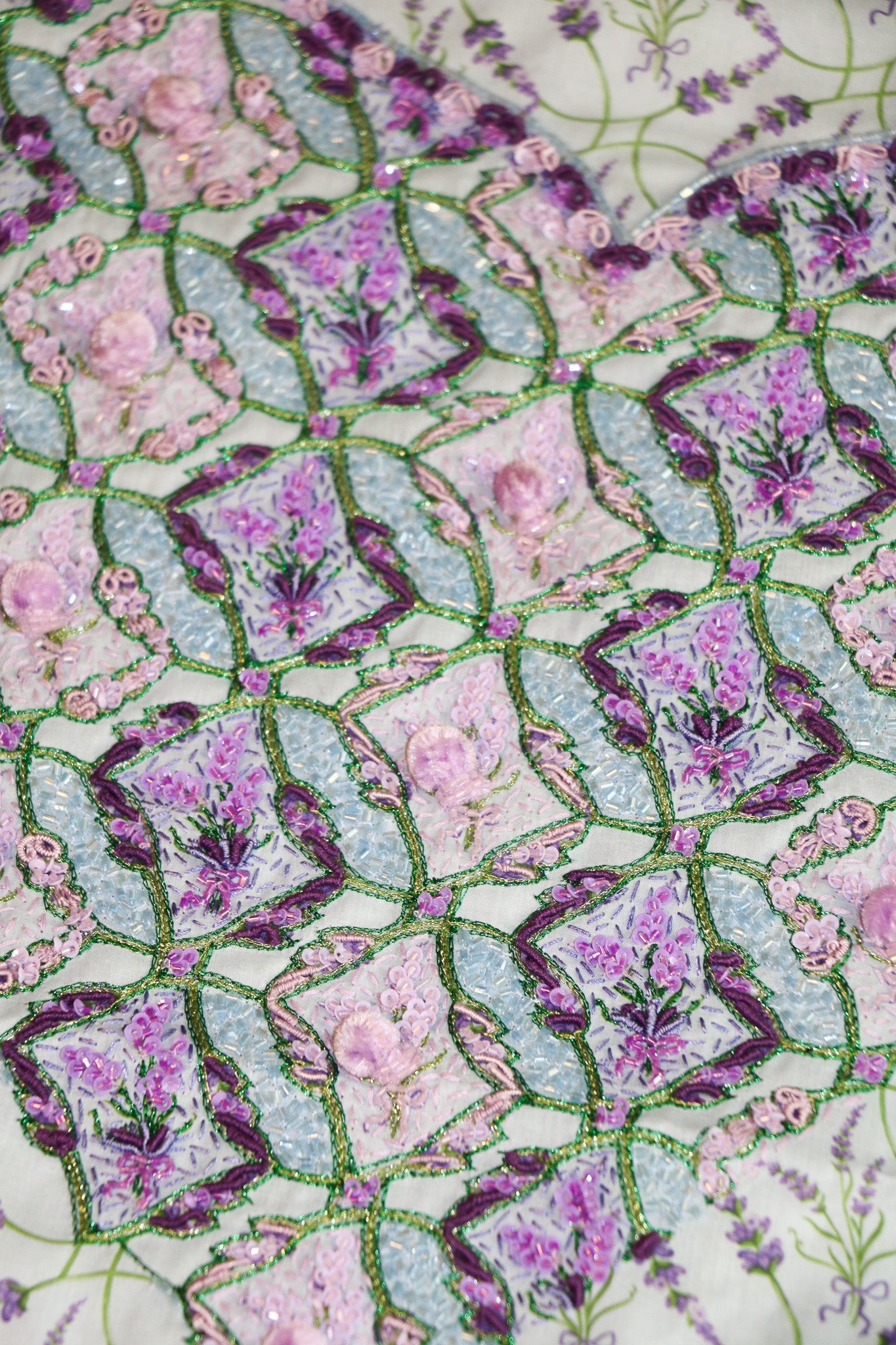 Soft lavender blooms rest within golden pathways, like whispers held in silk. Each hand-embroidered detail speaks of grace, stillness, and quiet devotion. Delicate yet certain, this mukhawar is a promise of beauty that never fades.