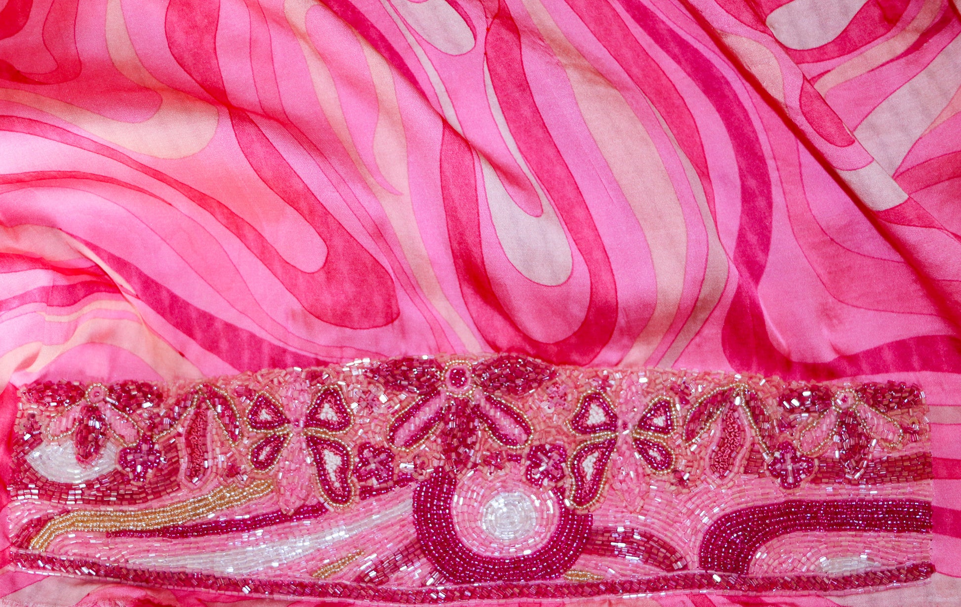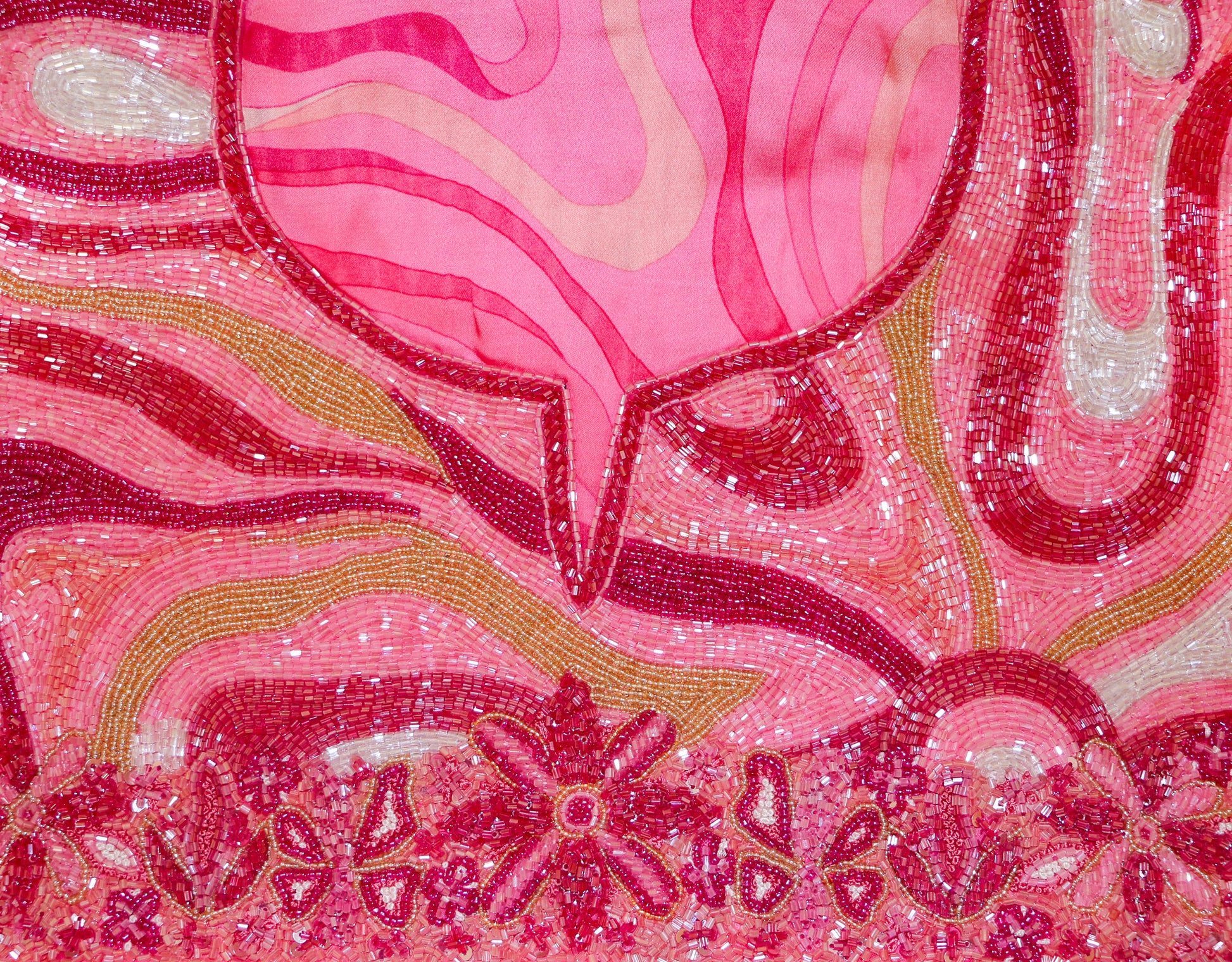 A rosé-hued reverie, crafted in thousands of shimmering beads, glowing with vintage charm.